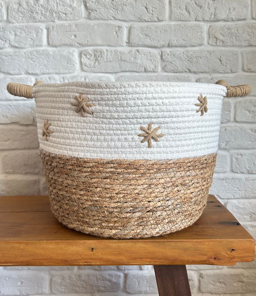 Cesto Decorativo Redondo em Fibra Natural e Algodão Branco.