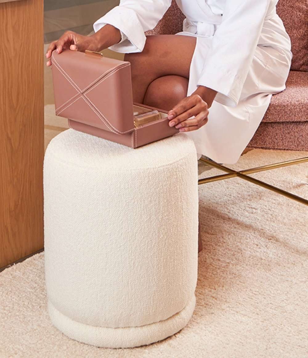 Com seu revestimento em tecido bouclé, que proporciona uma textura suave e convidativa, e uma base sólida em madeira, este pufe é a combinação perfeita entre o moderno e o natural.
