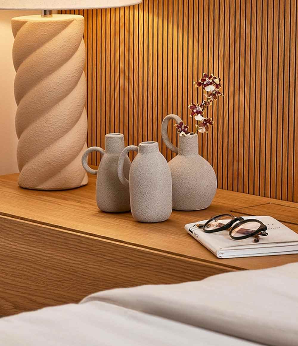 Trio de Mini Vasos Decorativos em Cerâmica Cinza com Alças. Contém 3 peças distintas.