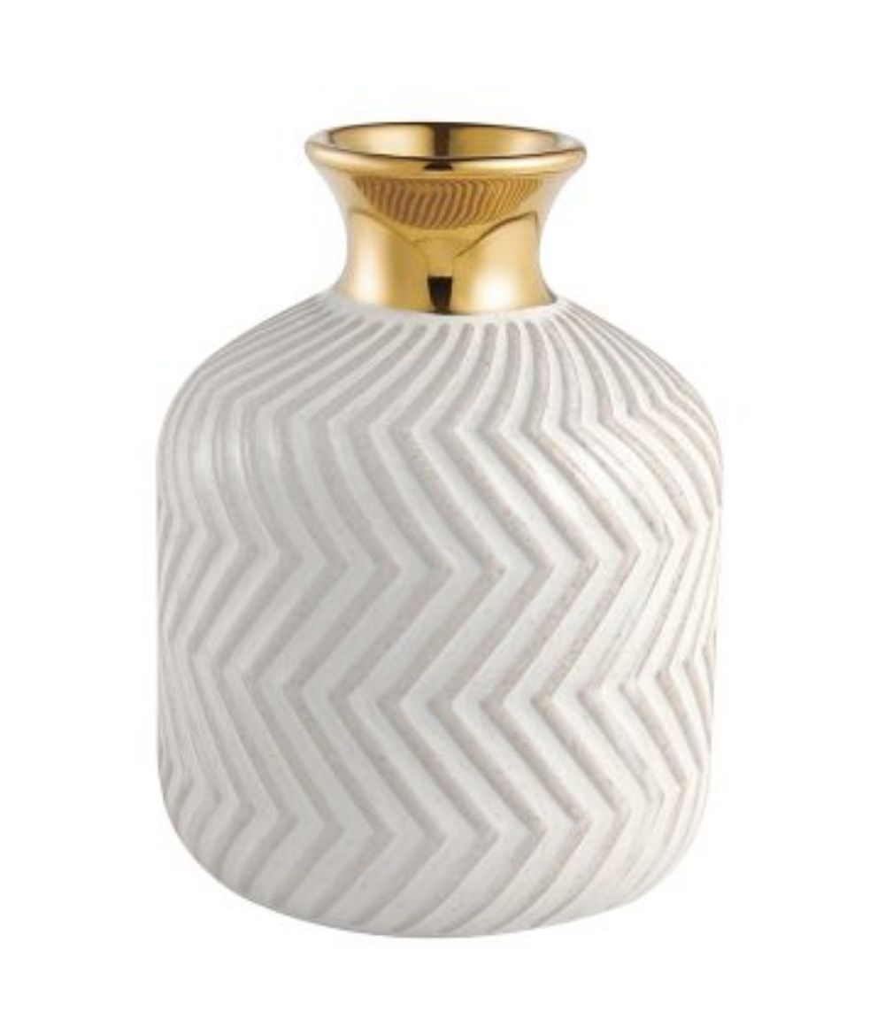 O Vaso Decorativo em Cerâmica Chevron com Topo Dourado, é uma peça que combina simplicidade e elegância, fazendo dele uma escolha perfeita para qualquer ambiente. Com seu requintado trabalho em cerâmica, o vaso apresenta um design em padrão chevron que acrescenta textura e profundidade visual, destacando-se como um vibrante objeto decorativo. O toque sofisticado do acabamento dourado, oferece um contraste luxuoso contra a superfície da cerâmica, acentuando sua beleza e classe.